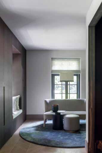The front bedroom has its own seating area, including a Wolterinckdesigned fauteuil and ottoman from Cervino in stone-washed leather. A kitchenette is secreted in a niche so that guests may make coffee in the morning while enjoying the view. The bedrooms are made private with