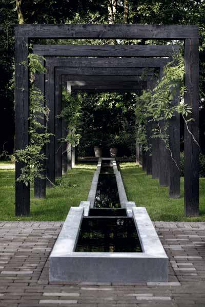 Similarly, in the garden there are distinct areas; soft neutrals in perennials and vibrant colors in pots. Yet a sense of wholeness emerges, underscored by the striking, horizontal water element topped by a pergola. A gate and fences, designed by Wolterinck, and high yew hedges ensure privacy. Dark conifers and excess plants were cleared, allowing the beautiful sweetgum, beech, and holly trees to enhance the woodsy, spacious atmosphere.