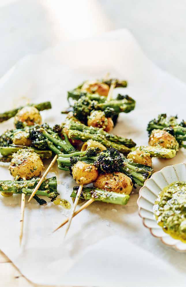 Dit recept is bedacht om de eerste aardappels, paarse spruitbroccoli en groene asperges te vieren en om die arme veganisten en vegetariërs, die zo vaak tekortkomen bij barbecues, een plezier te doen. Je kunt het recept verdubbelen voor grote eters; ik heb de porties bescheiden gehouden, omdat ik ervan uit ben gegaan dat er verschillende salades en brood bij de spiesen worden geserveerd. Maak de enorm veelzijdige Salsa verde (zie blz. 219) of bedenk zelf een variatie op basis van een verse pesto.