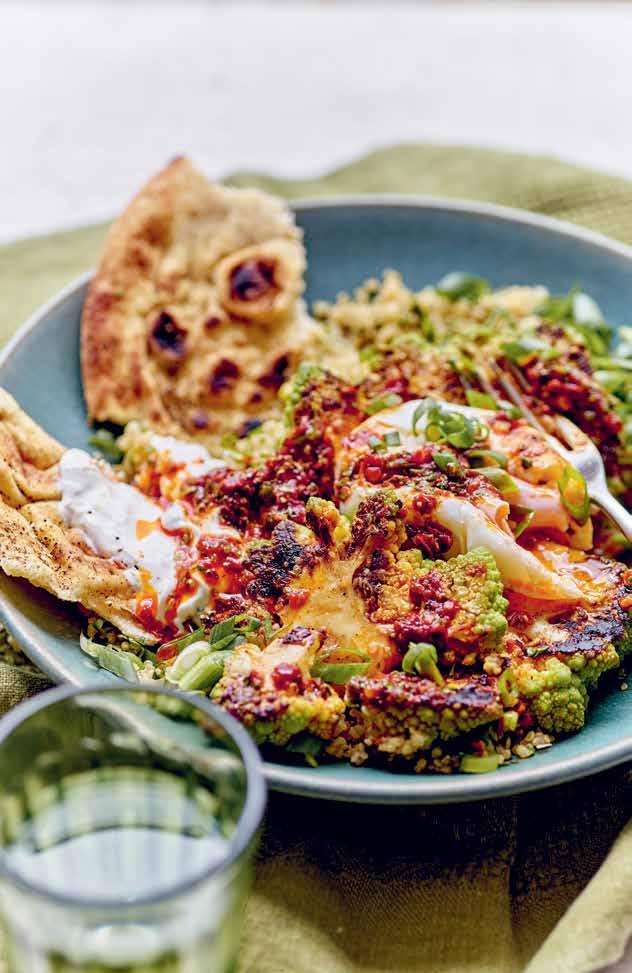 Serveer de romanesco, yoghurt en eieren op de groene quinoa in ondiepe kommen, lepel de dressing erover en leg de bewaarde takjes koriander en de partjes citroen erbij. Strooi de groene ringetjes lente-ui erover en druk er aan de zijkant warme platbroden in.