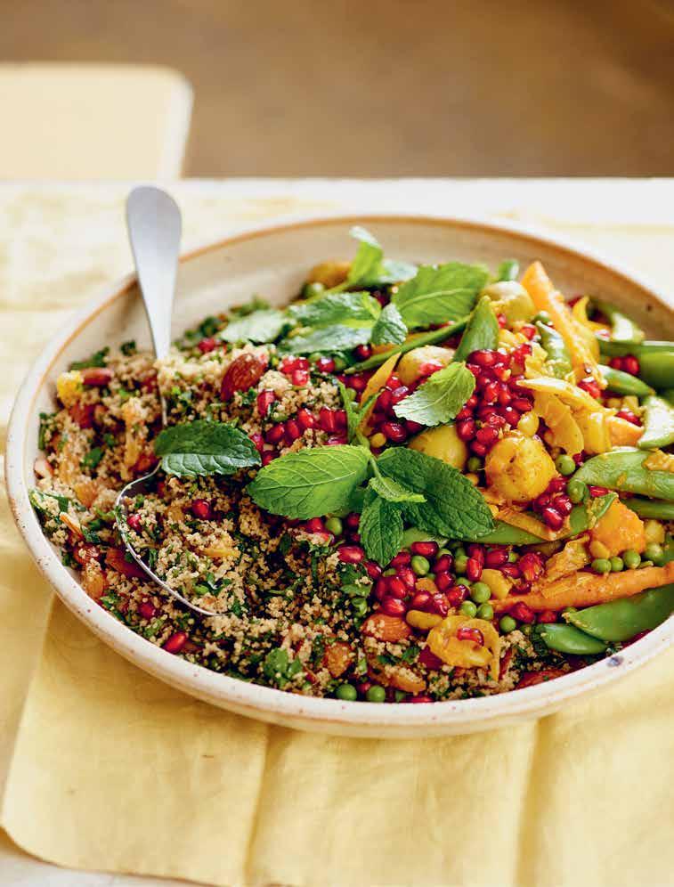 Als je deze kleurrijke tajine met een simpele versie van couscous serveert, zoals op de foto, wees dan royaal met alles wat je erdoor mengt (van droge naturel couscous wordt niemand blij). Ik schenk hete groentebouillon over droge, volkoren couscous, breng hem op smaak, voeg boter (of olijfolie) toe en laat hem een paar minuten staan. Vervolgens worden er lekker veel fijngehakte zachte kruiden, geraspte citroenschil, gehakte gerookte amandelen, granaatappelpitten en reepjes gedroogde abrikozen, plus wat citroensap en extra blaadjes munt door gemengd.