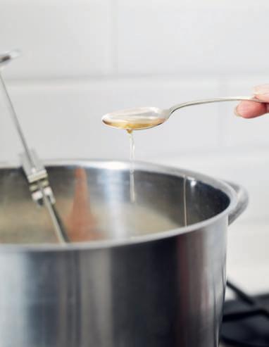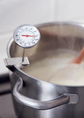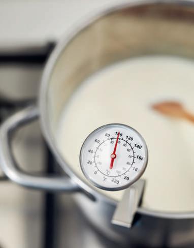 2 Giet de room in een pan en verhit hem op matig vuur tot 85 °C. Blijf continu roeren om te voorkomen dat de room aan de bodem van de pan vastkoekt en verbrandt.