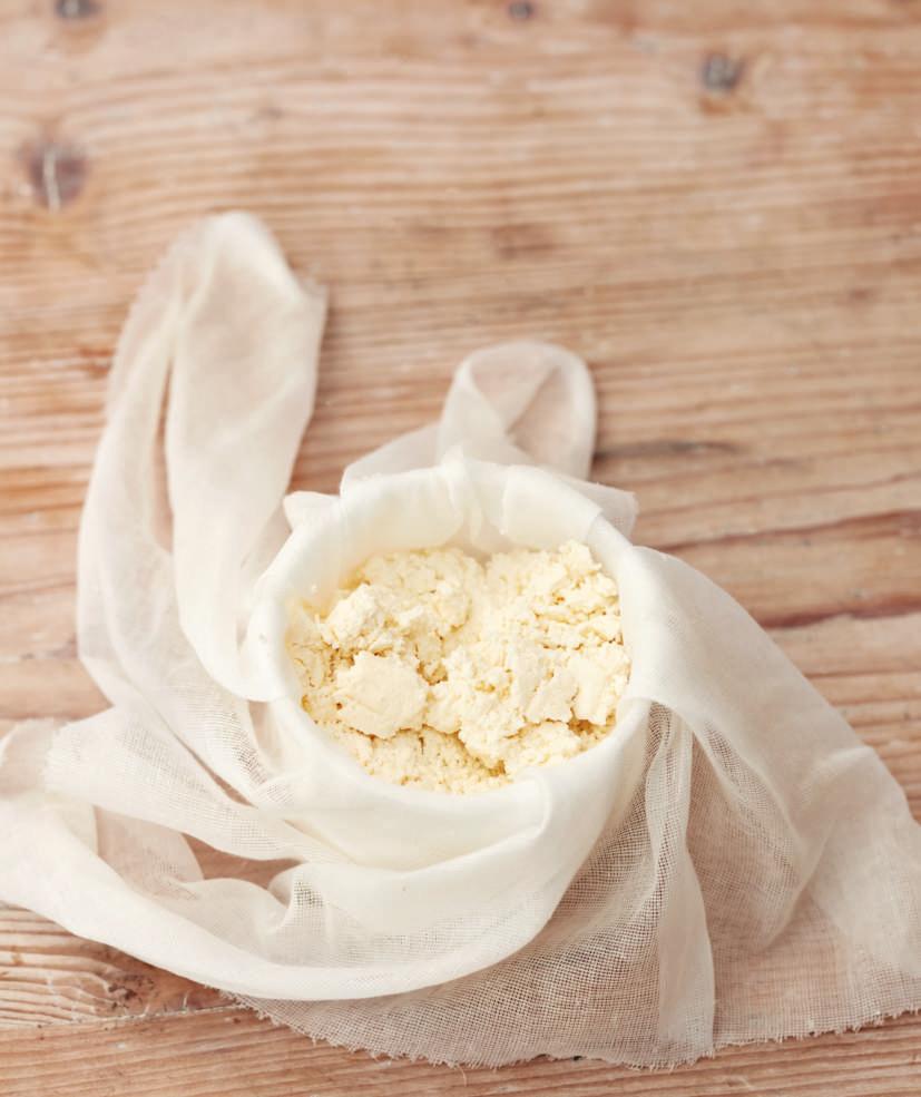 4 Leg de kaasdoek of neteldoek over een kleine kom en schep de wrongel er met een schuimspaan in. Volg de stappen op blz. 24-25, maak er een buidel van en hang hem ongeveer 3 uur op om de wei eruit te laten lekken.