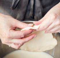 11 Knijp de randjes bij elkaar, draai ze strak dicht en maak er een bol van. Doe hetzelfde met de rest van de wrongel en het roommengsel.