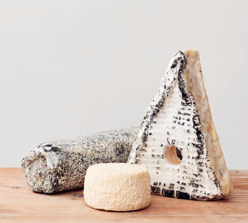 Sainte Maure (links) is een klassieke geitenkaas uit de Loirestreek, met een zeer herkenbare vorm. De jonge kaasjes zijn zo delicaat en kruimelig dat ze met een dun strootje bij elkaar gehouden worden. De verse kaas krijgt een aslaagje en wordt dan gerijpt tot je de kenmerkende romige, scherpe en rijke boomstammetjes hebt.
