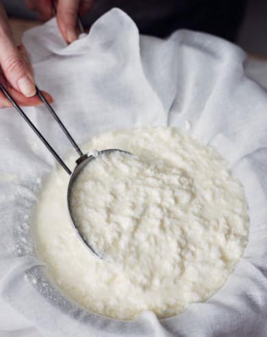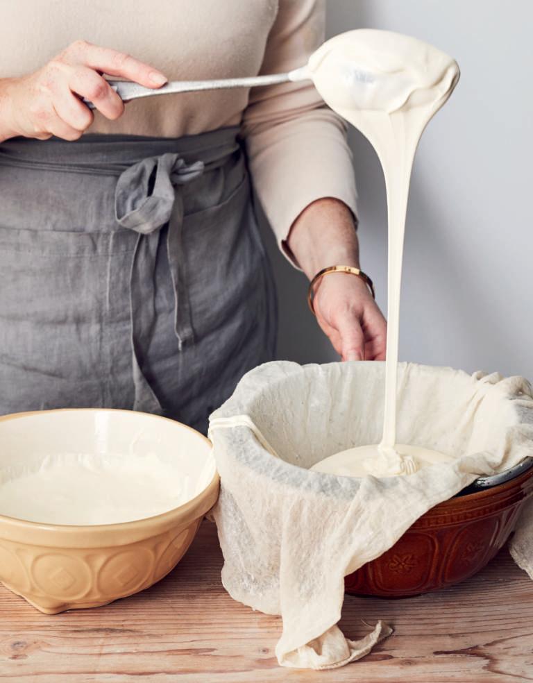 5 Bekleed een vergiet met kaasdoek of neteldoek, zet het op een grote kom en giet de room erin.