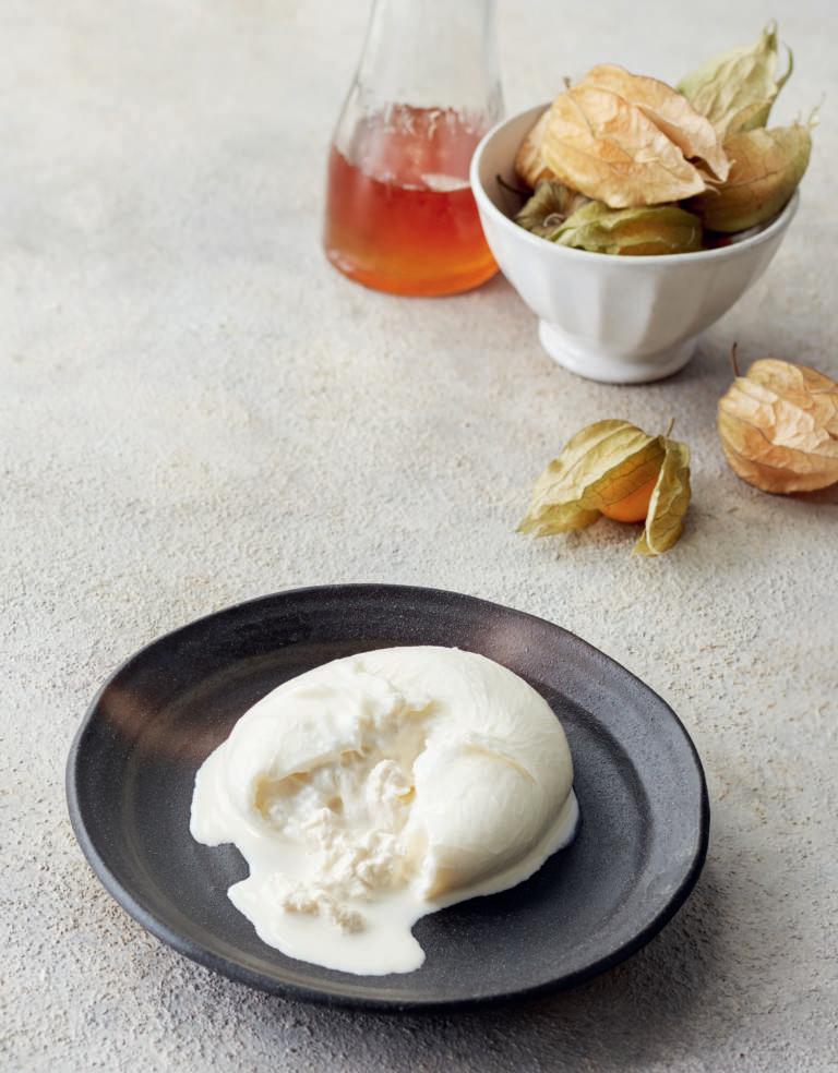 12 Leg de bollen burrata in de kom ijswater en laat ze voor het serveren 45 minuten opstijven, of bewaar ze maximaal 1 week in een zoutwaterbad (zie blz. 46) in de koelkast.