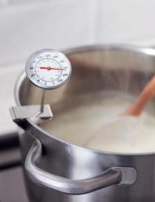 Benodigdheden: groot stuk kaasdoek of neteldoek, keukenthermometer