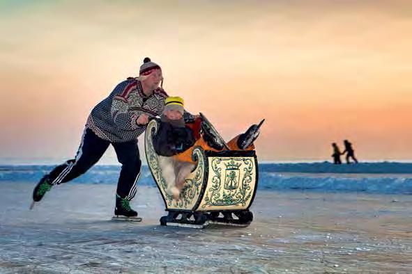 ▿ 17 January Hindeloopen, on the eastern shores of IJselmeer lake. A man on skates pushes his son on an antique sled that they found in the attic.