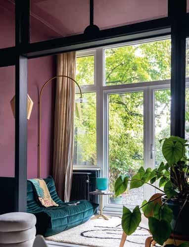 Hier komen natuurlijk een stuk durf en spanning bij kijken, maar in nieuwbouw moet je sfeer maken. Grof gezegd is het huis meer rechttoe rechtaan vanbinnen en kan je met verschillende dingen aan de slag gaan. Denk aan de indeling van je huis (zie blz. 75). Vraag je af of je een open haard kan creëren in de woonkamer. Welk type vloer kies je uit (ga je voor hout of een gietvloer)? Wat doe je met de keuken? Er zijn zoveel dingen die bepalend zijn voor de kleur. In oude huizen werkten ze veel met ‘kamers’, de en-suitekamers. Vooren achterkamer en soms zelfs ook nog een serre eraan. Hierdoor kan je heel makkelijk met een bepaalde kleur starten en per ruimte stoppen. Dat geldt dus ook voor het plafond. Nieuwbouwhuizen hebben vaak één grote ruimte met in ieder geval één enorm lange muur. Wat doe je dan met kleur? En over het plafond gesproken… dat is ook één geheel. Ga je dan het complete plafond donkerblauw maken?! Mijn advies is te proberen toch kamers te creëren. Bijvoorbeeld door het toevoegen van een en-suitepui, kasten van vloer tot plafond, een open haard vrij in de ruimte of juist tegen de muur of ‘fake’ kolommen waardoor de lange muur wordt onderbroken. Ik ben vaak dol op oneffenheden in een huis. Hoekjes, kolommen tegen de muur, knikjes in de muur, een nieuw verschil, want daarmee kan je beginnen met kleur en een aparte kamer creëren. Probeer uit te zoomen en te kijken hoe je sferen kan maken met kleur, want dat is de basis. En vind je het spannend om plafonds te schilderen in een kleur, begin dan eerst met de wc of hal. Dit zijn ruimtes die je snel kan schilderen en waar je goed kan experimenteren.