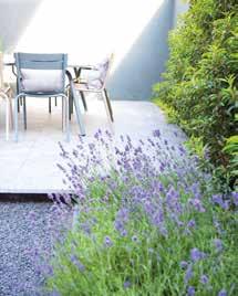 Sterke vaste planten met fraaie bloemen zijn voor de border naast het terras gekozen. Hier is een beproefde combinatie gemaakt van herfstanemonen (Anemone x hybrida ‘Honorine Jobert’), salie (Salvia nemorosa ‘Mainacht’), blauwe distel (Eryngium planum), ooievaarsbek (Geranium ‘Johnson’s Blue’), de kranssalie (Salvia verticillata) en zomeraster (Aster amellus). Bij de tuinbank is een smal vak gevuld met lavendel, achter de tuintafel groeit geurige tijm.