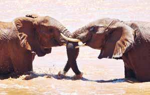 zien hoe de olifanten elkaar helpen in deze moeilijke situatie. Als een jong in moeilijkheden raakt, snellen gelijk twee of drie volwassen olifanten toe om een helpende ‘hand’ te bieden. Met hun slurf, ook de vijfde hand genoemd, trekken ze de kleine weer naar zich toe en geven het een extra zetje in de rug. Geboeid kijken we naar dit tafereel totdat de olifanten veilig de overkant bereiken. Snel tel ik deze reuzen, iets wat altijd bijzonder voor me blijft.