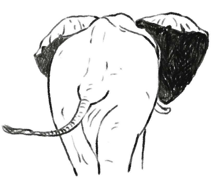 heel hard wegrennen. Mijn blik valt op de twee volle borsten die tussen haar voorpoten hangen, een opvallend verschijnsel dat verder alleen bij primaten voorkomt. Dat betekent dat deze moeder een jong heeft. Mijn blik flitst heen en weer. Een klein slurfje komt achter haar rechterachterpoot tevoorschijn. Dan stapt een olifantje uit moeders schaduw. Het dartelt rond, passeert me op anderhalve meter afstand en loopt al spelend richting de rivier. Het grijze staartje met aan het eind een zwarte kwast vliegt van links naar rechts. Maar de moeder, groot en sterk, staat 2 meter achter me en schrikt van mij. Ze tettert luid, wat betekent dat ze indruk wil maken. De rimpels in haar huid lijken op deze kleine afstand gleuven van wel een vingerbreedte diep. Ik kijk in haar donkere ogen en zie zand aan haar wimpers. Ze doet een stap naar me toe en begint met haar oren te wapperen. De grote oorschelpen gaan van voor naar achter en ik zie de rafelranden aan de uiteinden. Een olifantenoor is als een vingerafdruk bij de mens: uniek. Haar slurf houdt ze hoog in de lucht om te laten zien hoe groot ze is.