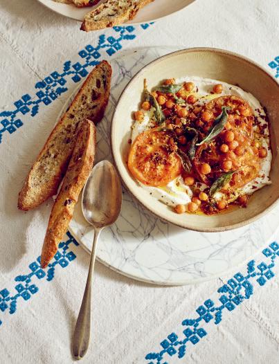 De magie van dit gerecht staat of valt met de tomaten die je gebruikt. Hoewel zelfs smakeloze exemplaren lekker kunnen worden met goede olijfolie en knoklook in de oven krijg je, als je met écht speciale tomaten begint – het liefst grote, oude rassen –, hemelse, stroperige gekonfijte tomaten die je met de gekruide kikkererwten over sesamyoghurt kunt scheppen. Simpel en chic.