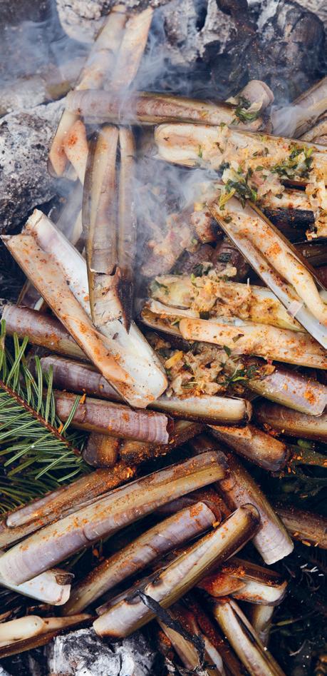 1 | Spoel de scheermessen onder koud stromend water en zorg dat alle zand eruit is. Neem een geperforeerde grillplaat voor je barbecue en bedek die met de dennennaalden en het zeewier. Leg er de scheermessen op, plaats het rooster op je barbecue en steek het bed van dennennaalden en zeewier in brand. Gooi de vuurkruiden in de kolen voor extra aroma. Laat de scheermessen kort garen tot ze opengaan. Blus ze af met Noilly Prat.