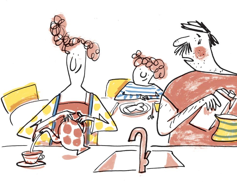 Papa frommelt een vierde b oterham in zijn mond. Mama pakt nog een lep el yoghurt.