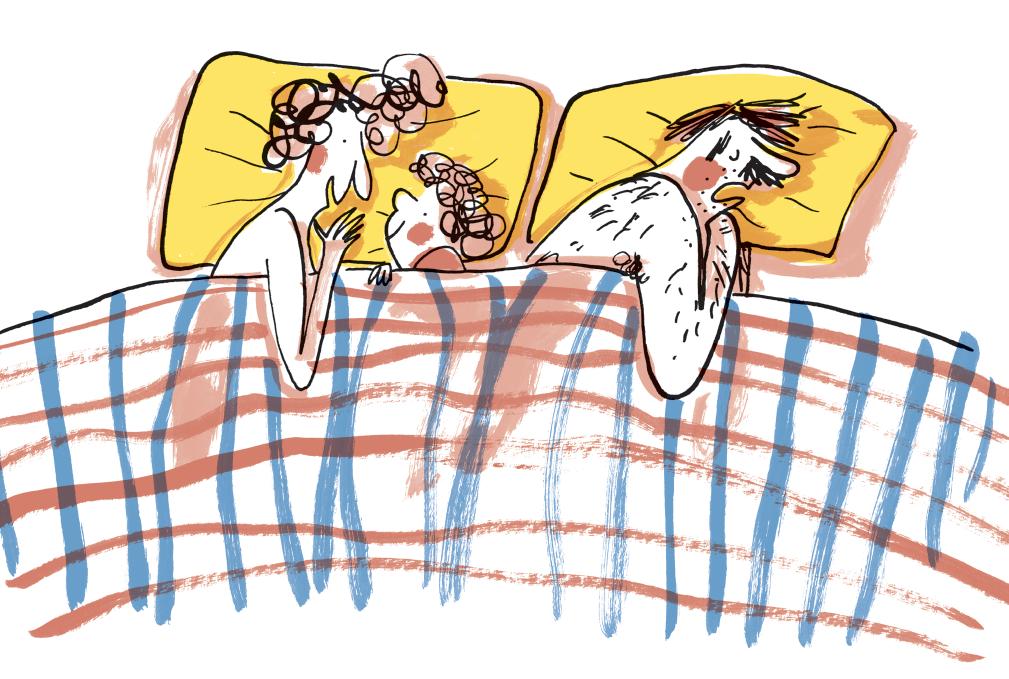 Papa en mama schrikken zich kap ot en zitten ineens rechtop in b ed.