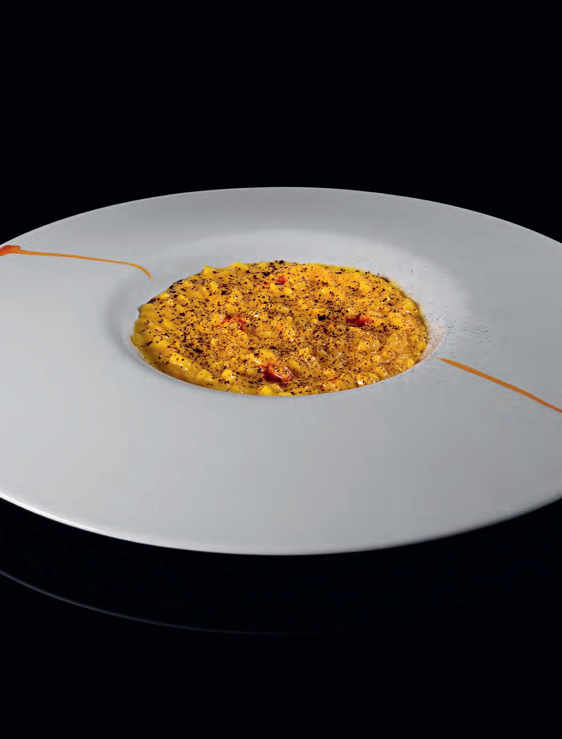 ‘The root and the flower, represented by liquorice and saffron, are the most extreme parts of the plant; one low, deep and hidden, the other tall, seductive and luminous, almost like a dialogue between opposites: origin and growth, birth and rebirth,’ explains Alajmo, who is also known as Il Mozart dei Fornelli (The Mozart of the stoves) for the lightness, depth of flavour and fluidity of his cuisine. According to Alajmo, ‘the colours of the risotto reflect the contrast, at the same time maintaining a hidden truth, while the dark powder manifests golden reflections only in the presence of light.’