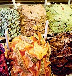● In deze gelateria zijn de bollen groot en de smaken rijkelijk.