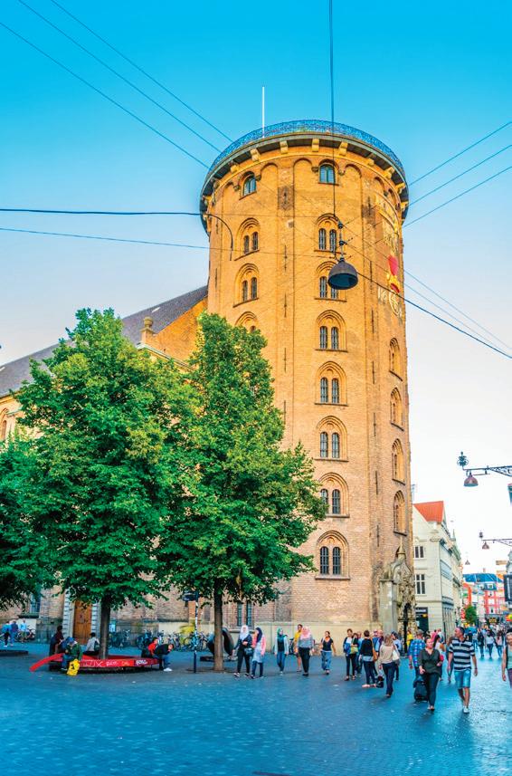 Í Beklim de Rundetårn. Vanaf het uitzichtpunt boven op de Ronde Toren, dat u bereikt via een spiraalvormig hellend vlak, geniet u van de bevoorrechte geografische ligging van Kopenhagen, in het uiterste zuiden van het Scandinavisch schiereiland. T blz. 35.