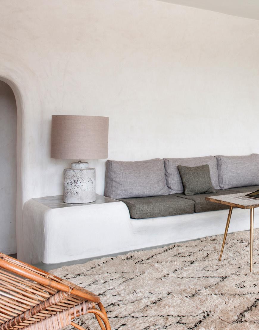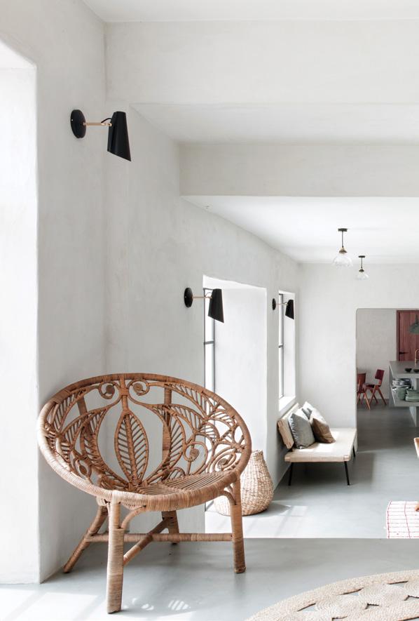With this project, she was looking to recreate that sense of balance that exists on the island; so full of life in summer and so calm and cosy on winter days. She therefore settled on a natural and textured colour palette, while, in terms of materials, wood, wicker, bamboo, cement and natural plaster take centre stage, with splashes of colour appearing through objects, ceramics and paintings. ‘With the exception of the herringbone terracotta tiles in the bathroom, I wanted the flooring to be uniform throughout the entire house, maintaining the sense of space and light. All the walls are finished in a simple, raw plaster that gives a natural, textured finish as opposed to paint or colour.’ Pieces of furniture, drawn from a mixture of countries and exotic tastes, highlight Sarah’s unique style. ‘I love flea markets, vintage fairs, French antiques. I’m completely obsessed with chairs and continue to collect them for no reason. I adore mid-century designs from the 1960s and 1970s, especially wicker and rattan, as well as selected African pieces I’ve collected on various trips.’ It was well worth the wait, and now there’s nothing Sarah loves more than watching the sunrise in her bedroom as she indulges in a ‘slow and lazy’ breakfast.