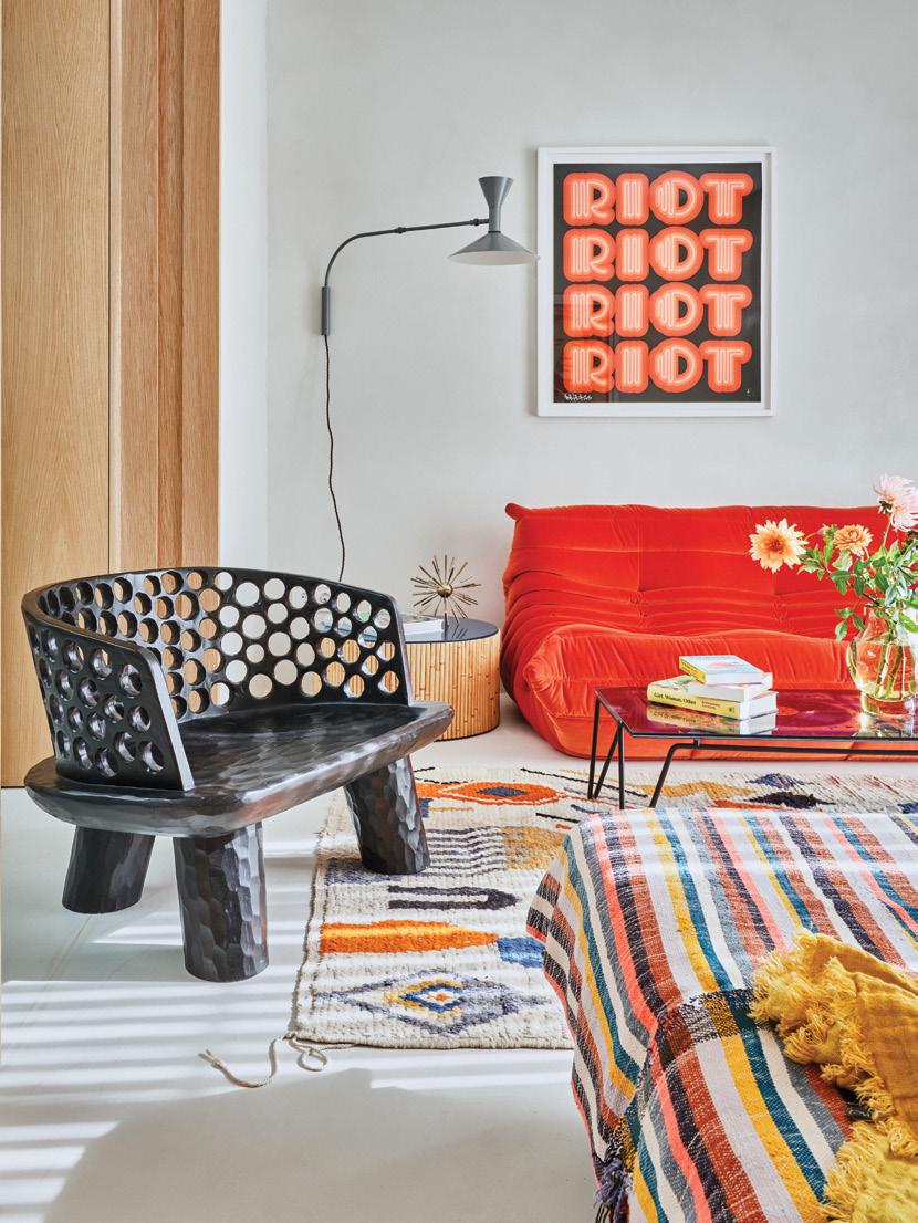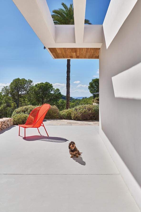 shades of grey. Initially, we were afraid this might be a problem, but, luckily, from the outset they trusted us to guide them. We wanted to move away from the archetypal colours that have been used here on the island for decades: teal, blue, aquamarine; that is, the colours of the sea and the sky. The idea was to root the house in the landscape of the island, so we came up with a scheme centred around a palette of terracotta and ochre, the colours of the rich, living soil and the bright golden stone of Ibiza. ‘We set out to inject some fun, joyful personality and character into the home, using strong pops of colour with furniture, bathroom tiles, accessories, and, in particular, some amazing works of art.’