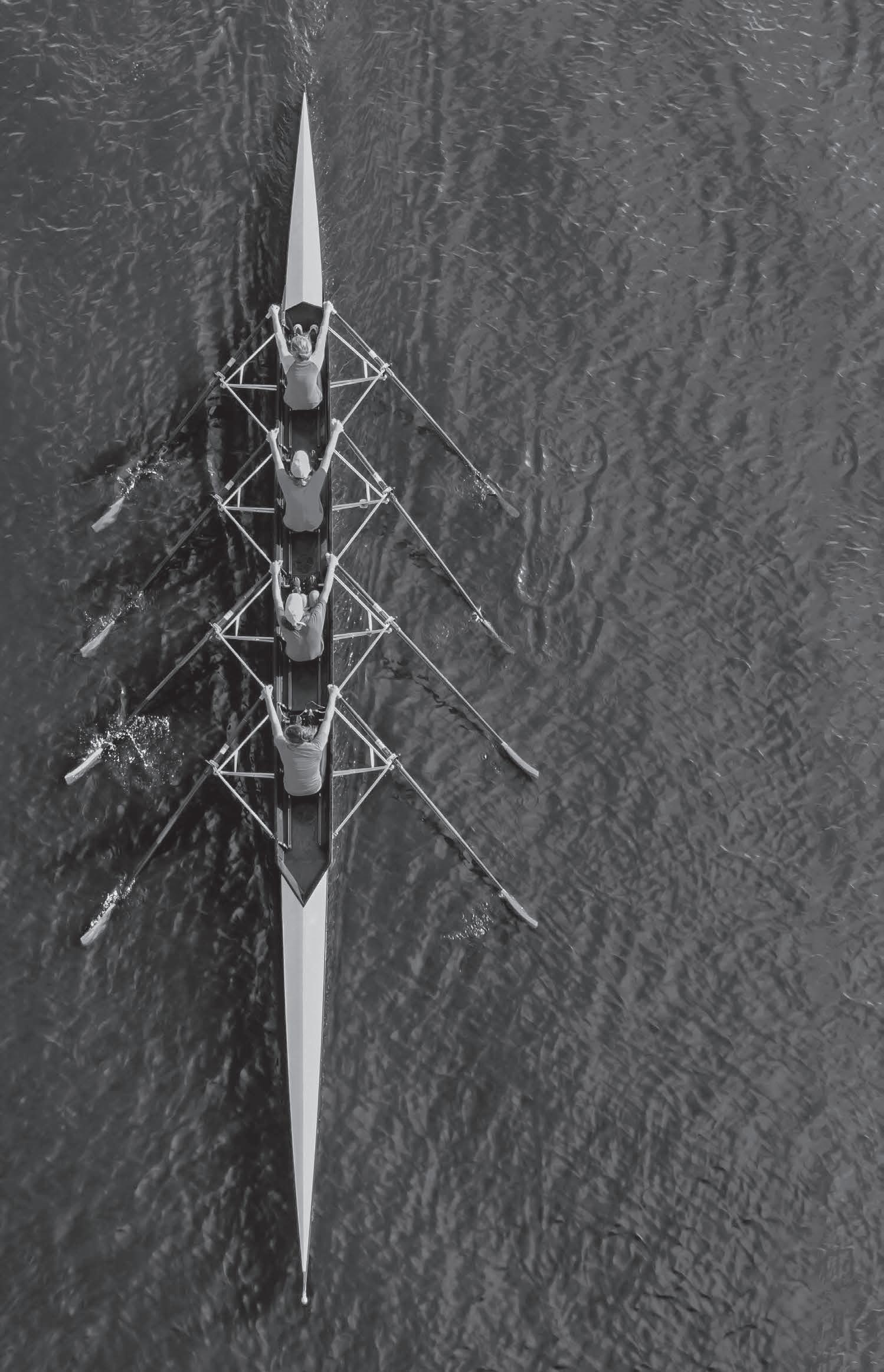 In basket – en meer algemeen in de sport – uit het ritme zich in de vlotheid en de soepelheid waarmee je je lichaam beweegt, in het vinden van de juiste kadans, de passes, het dribbelen en het vlot scoren Dat is niet zo maar in één simpel beeld te vatten. Daarom ben ik blij met de foto van het roeiteam op de cover, een suggestie van de uitgever. Het is een impactvolle visualisatie van de kracht van een groep mensen die geconcentreerd, in de flow van een vloeiend ritme, samen op weg zijn naar een gezamenlijk doel.