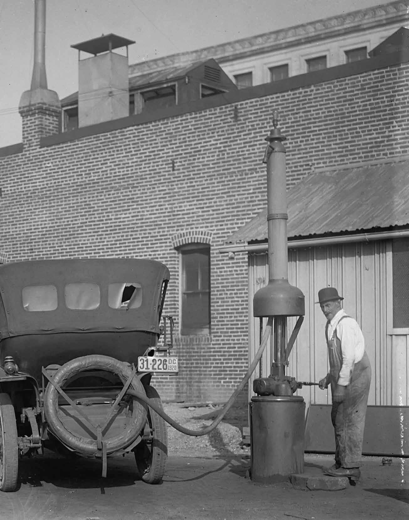 Early motorists could not just stop at purpose-built gas stations of the kind we know today—these did not become operational until the 1910s. Before that time, cars could be refueled at bulk outlets, where large quantities of gasoline were stored in above-ground tanks. Relying on the force of gravity to funnel the—highly flammable—liquid into the car’s gas tank, filling station employees would serve one customer at a time. By 1905, mechanized, manually operated gasoline pumps were in use. Besides fuel, these early filling stations would sometimes sell the various lubricants needed to maintain cars. The sale of auxiliary automobile maintenance products (oils, batteries, tires) would become an increasingly important part of gas station revenue in the following decades.