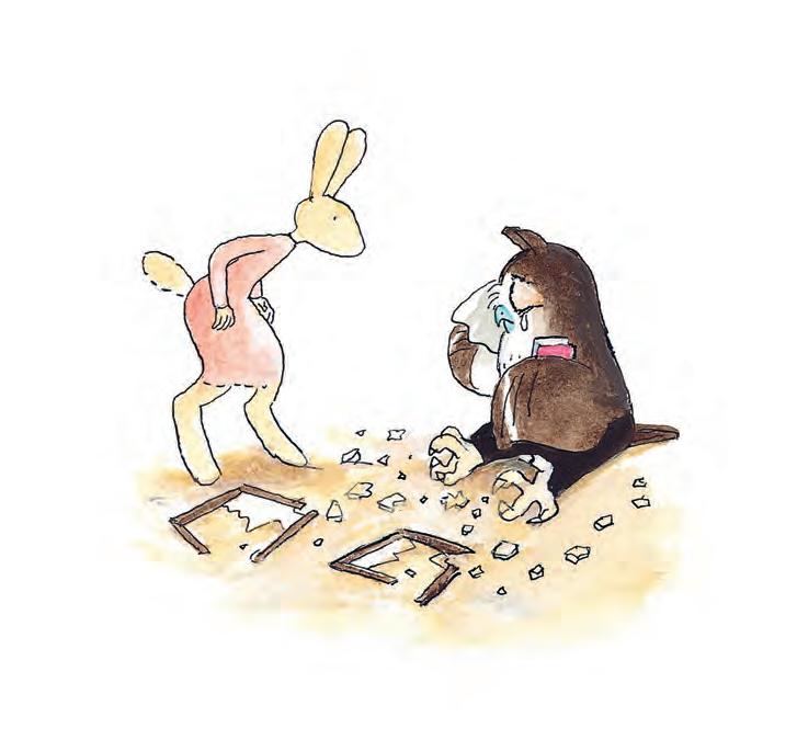 Haas vindt Uil in tranen. Hij zit op de grond in zijn huis. Om hem heen liggen stukjes glas.