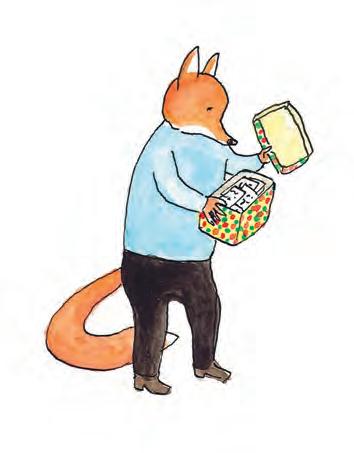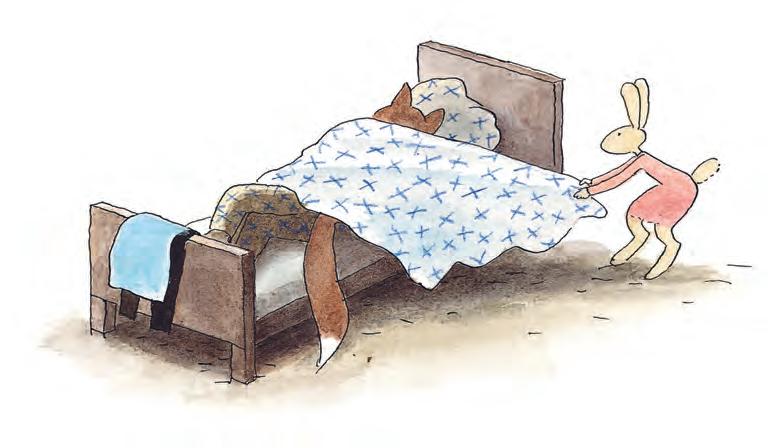 Daar is Vos eindelijk! Hij heeft zich haastig aangekleed.