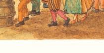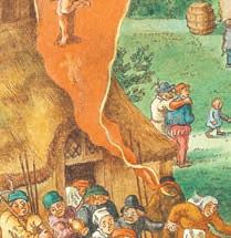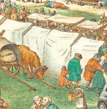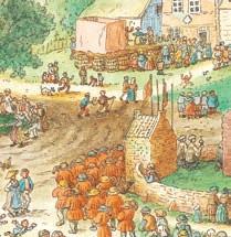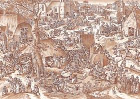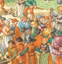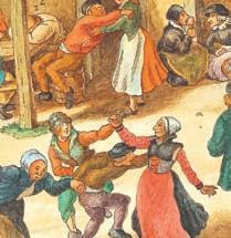 Een boerenkermis was een groot feest, zoals je op de tekening ziet. De kermis kon wel een paar dagen duren en heel het dorp feestte mee. Je ziet mensen die spelletjes spelen, gezellig praten, dansen en knuffelen. In de kraampjes kon je eten en drinken kopen, of stokpaardjes en ander speelgoed.