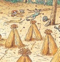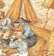 Daarom droeg bijna iedereen een gordel of riem. Daar werd van alles aan gehangen, zoals tasjes, bekers en dolken. Zie je mensen met riemen op de tekening?