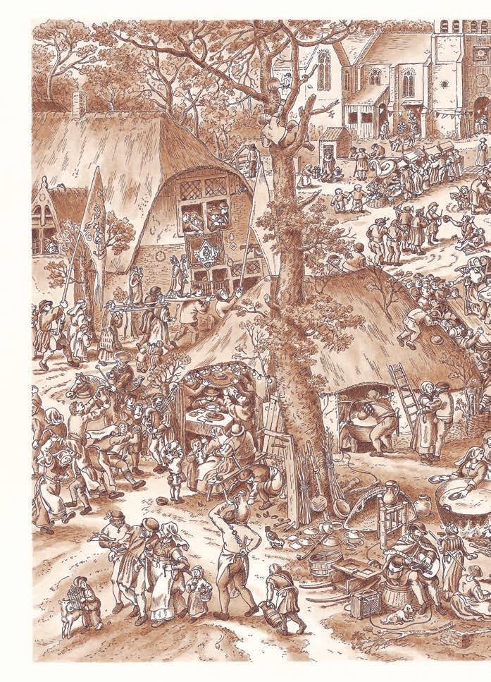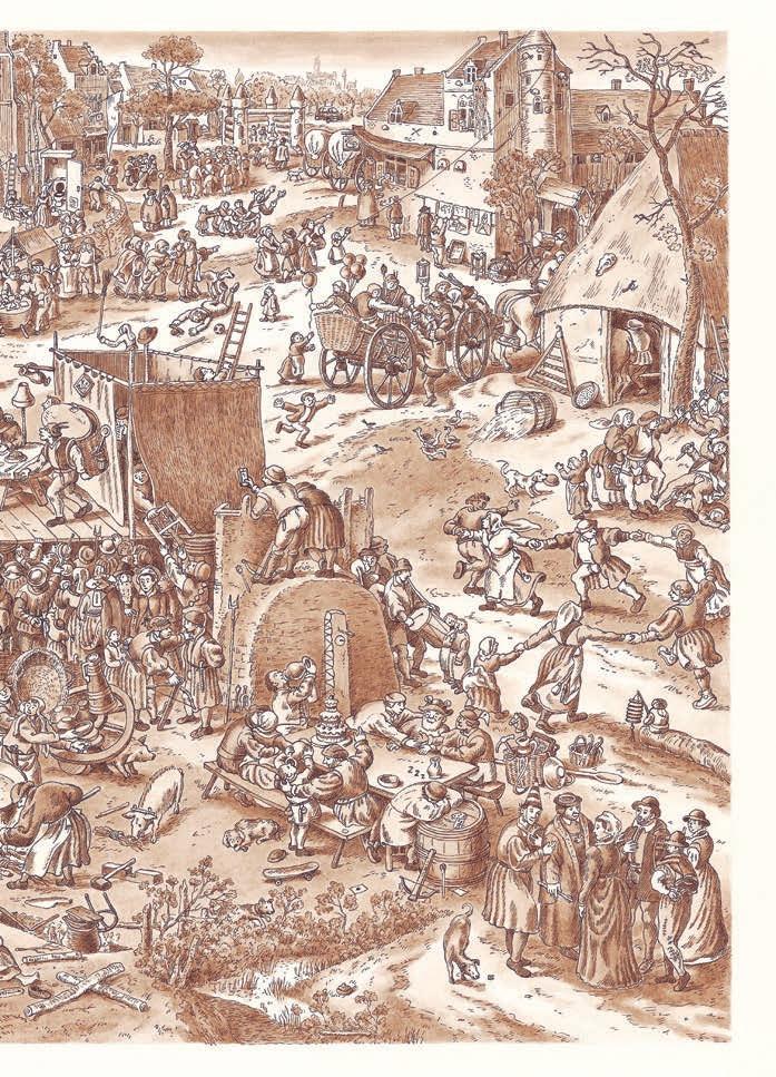 Op elf grote tekeningen, geïnspireerd op schilderijen uit de zestiende en zeventiende eeuw, ontdek je hoe kinderen speelden, wat mensen aten, hoe het leven in de stad was… Bij elke tekening horen weetjes die je meer vertellen over het leven van toen.