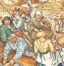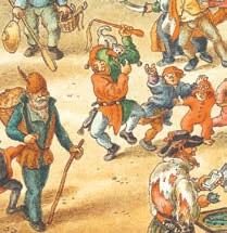 Een nar was iemand die de mensen op het feest aan het lachen maakte. Hij droeg vaak felgekleurde kleren en een hoed met belletjes eraan. Hij maakte grappen, tuimelde en deed andere gekke dingen. Op de tekening lopen er kinderen achter de nar. Vind jij hem ook?