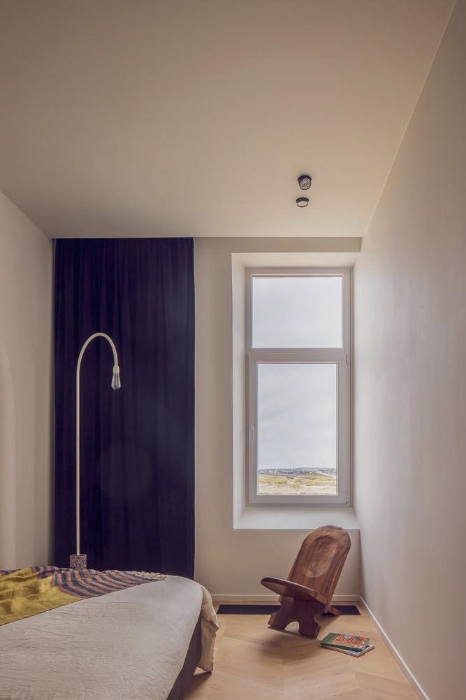 Architect Glenn Buydaert, de helft van het Belgische designmerk Bultin, verbouwde het pand eigenhandig en gaf het zijn eigen, intieme stempel. De afgeronde deuren fungeerden als leidraad en inspireerden tot nog meer zachte welvingen. Van het ellipsvormige keukeneiland op maat tot de iets hoger gelegen zithoek. Die maakt dat je ook vanuit je Togo-sofa optimaal van dat zeezicht kunt genieten terwijl je een plaatje van Tom Waits, D’Angelo of Tamino draait. Op de vloer nu eens een Hongaars visgraatparket, dan weer zandkleurige mortex met in de badkamer en het aanpalende toilet strakke, gele Winckelmanstegels.