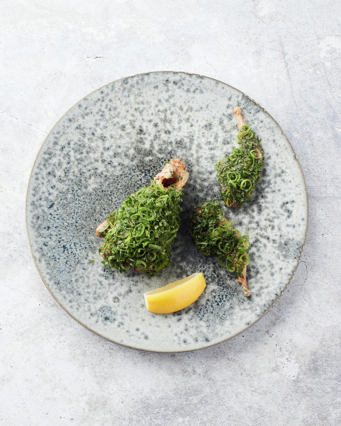 Deze kwartelbereiding is heel eenvoudig en zeker met de wat grotere, mooie Belgische kwartels van Filip Callemeyn, de misolak en de shiso-lente-ui. Een paar druppels citroensap erover en genieten.