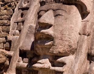 Een preklassieke stad? Op papier wel, dat voorspelt al niet veel goeds: de mooiste steden dateren namelijk uit de klassieke periode. En toch … Wanneer je voor het complex staat, valt je mond open: de ongewone kleine tempel aan de Caribische Zee is bekleed met vier maskers van