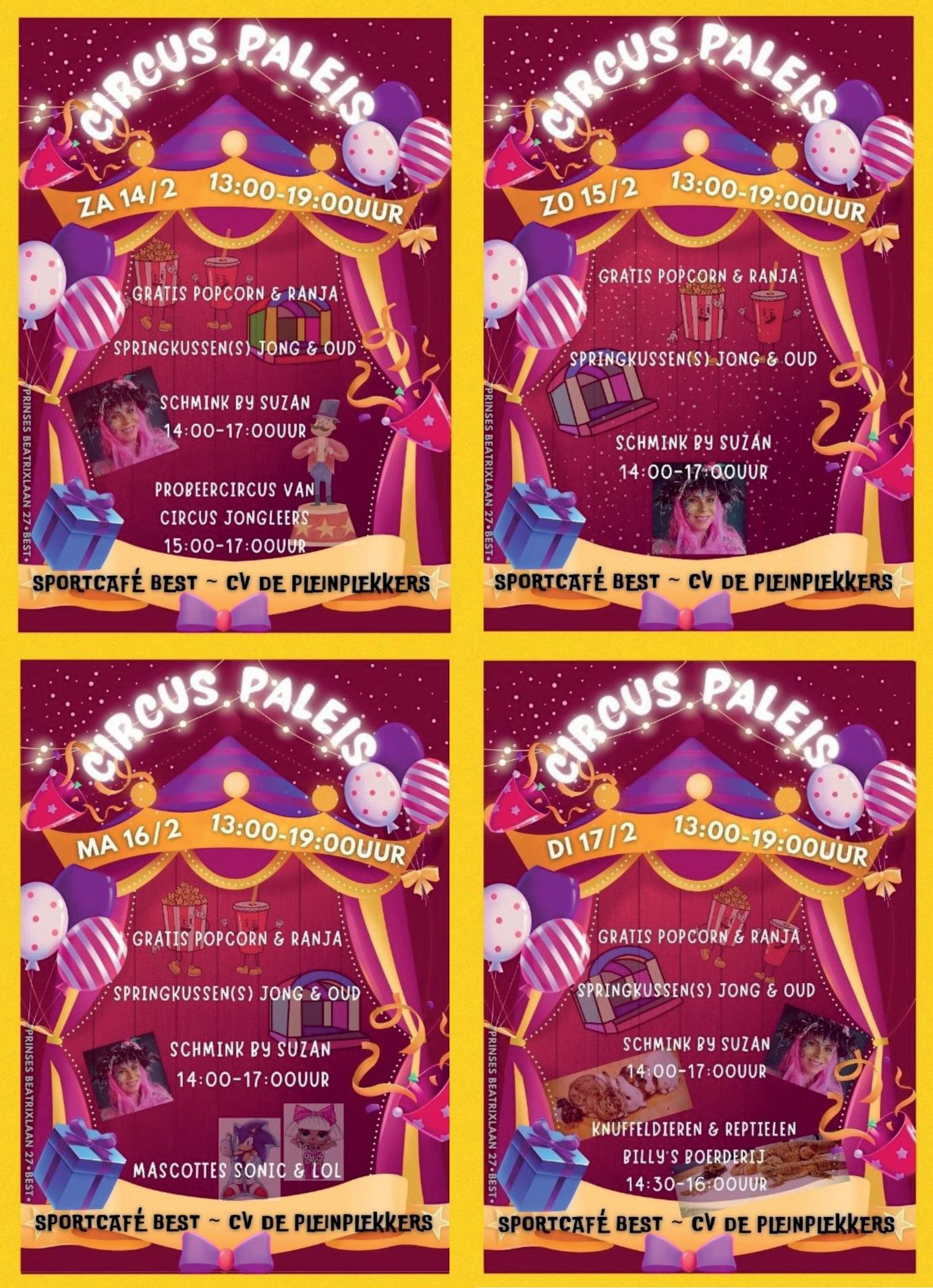 Het Sportcafé verandert in een vrolijke circuspiste met slingers, lichtjes en feestmuziek. Onder leiding van jeugdmarkies Rowan