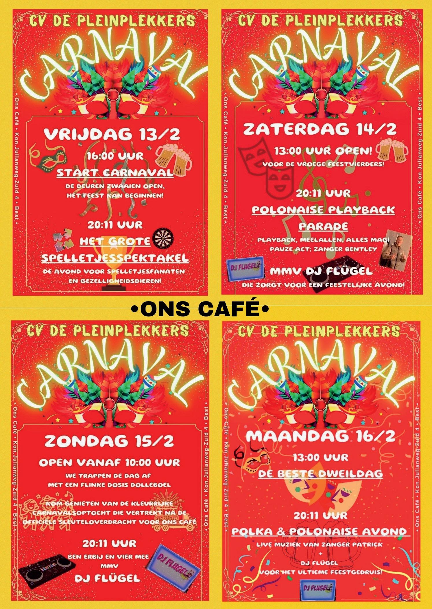 CV De Pleinplekkers maakt zich klaar voor een week vol kleur, muziek en gezelligheid. Het carnavalsfeest vindt plaats bij het Sportcafé (bij de sporthal) en Ons Café aan de Koningin Julianaweg.