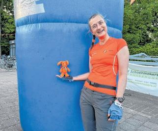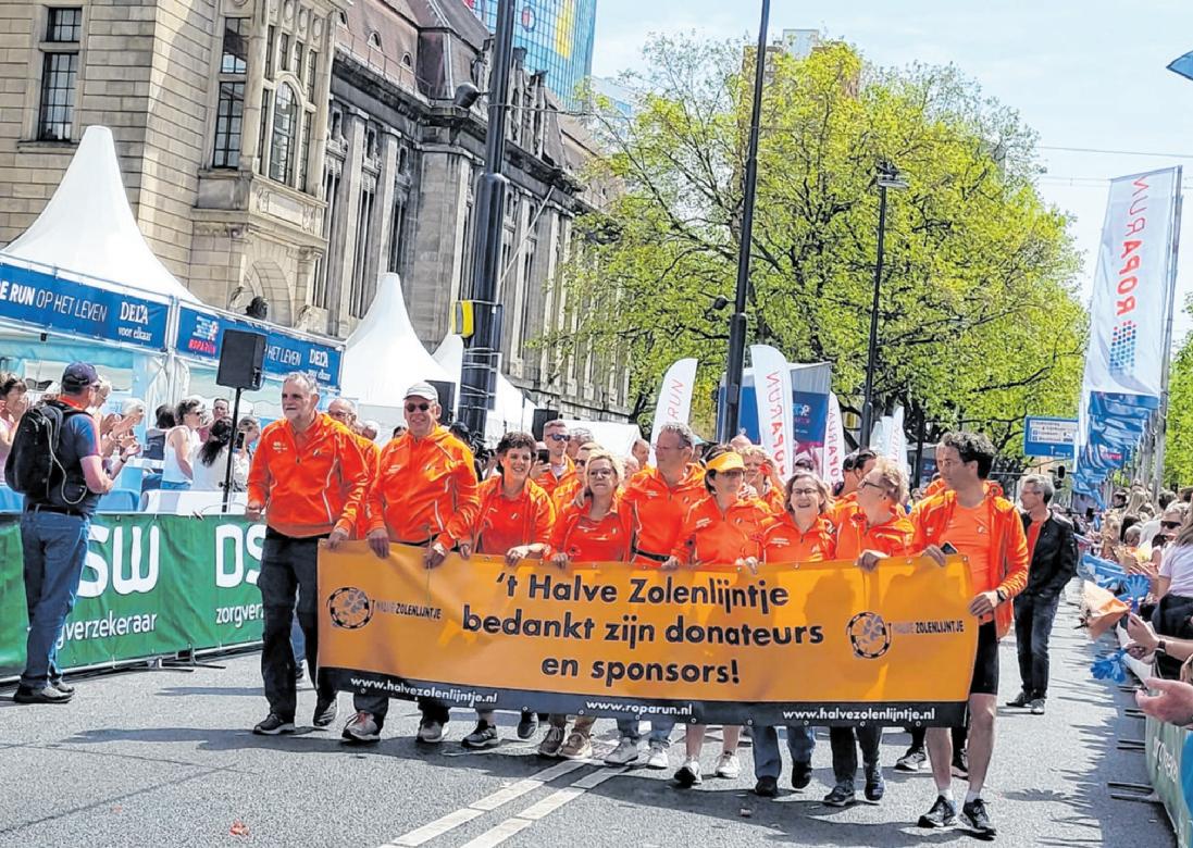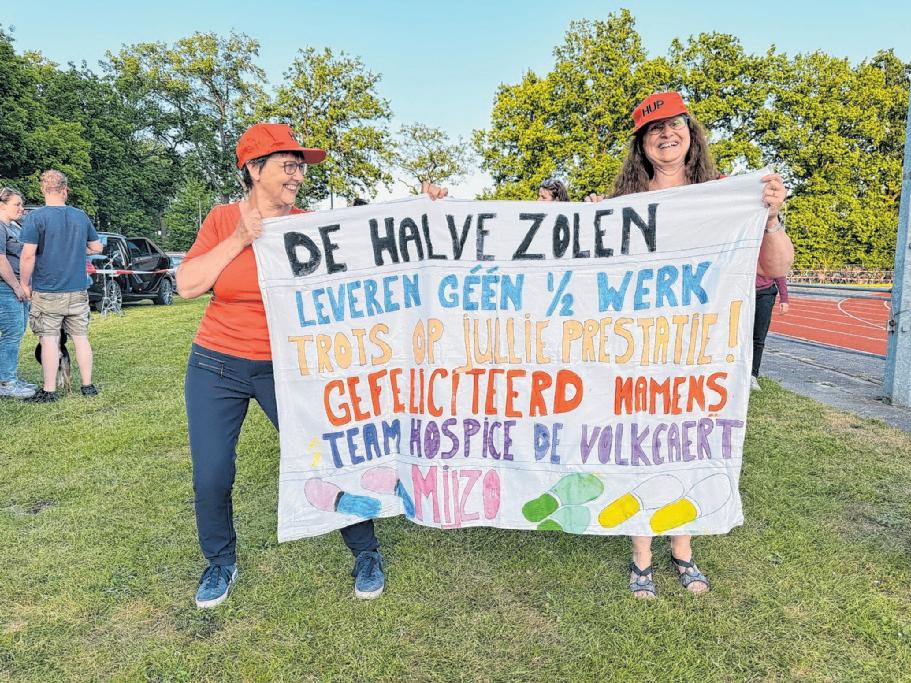 cliënten in de laatste levensfase, maakt een groot spandoek om ’t Halve Zolenlijntje aan te moedigen. ‘De Halve zolen leveren geen half werk’, staat er terecht op.