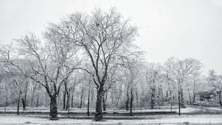 We zien een aantal bomen in een winters landschap met hier en daar enkele sneeuwvlokjes. De foto zou vanuit een auto of vanuit het huis gemaakt kunnen zijn. We laten de maker zelf even aan