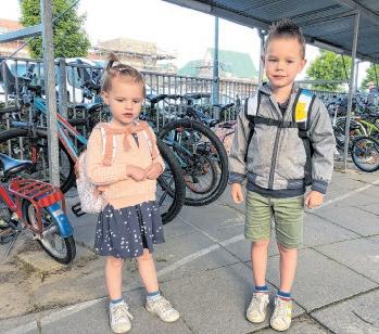 Stijn (4) en zijn zusje Milou (2,5) bij het fietsenrek van de Uilenpoort, op weg naar de eerste schooldag. (foto: Jeanny Wouters)