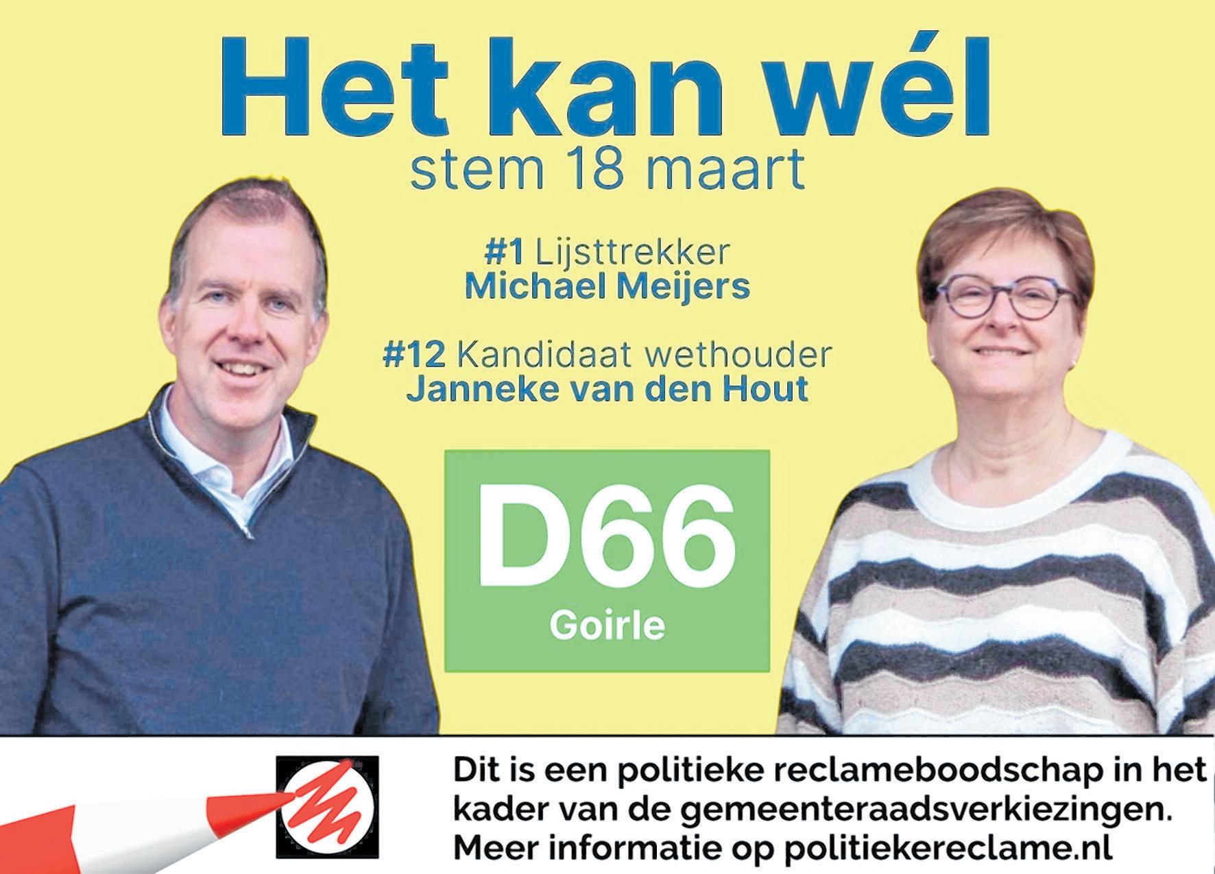 Michael Meijers is fractievoorzitter en gemeenteraadslid voor D66 en lijstaanvoerder. In het dagelijks leven werkt hij als docent Mechatronica bij AVANS Hogeschool in Breda, hij studeerde Luchtvaarten Ruimtetechniek aan de TU in Delft. Janneke van den Hout is lijstduwer, ze neemt de laatste plaats in op de lijst. Ze was in de bijna afgelopen periode wethouder, maar moest tussentijds aftreden vanwege onenigheid tussen PAG en VVD. Iedereen was het er over eens dat Janneke een uitstekende wethouder was. Herinneren we ons dat zij in tranen heen ging?