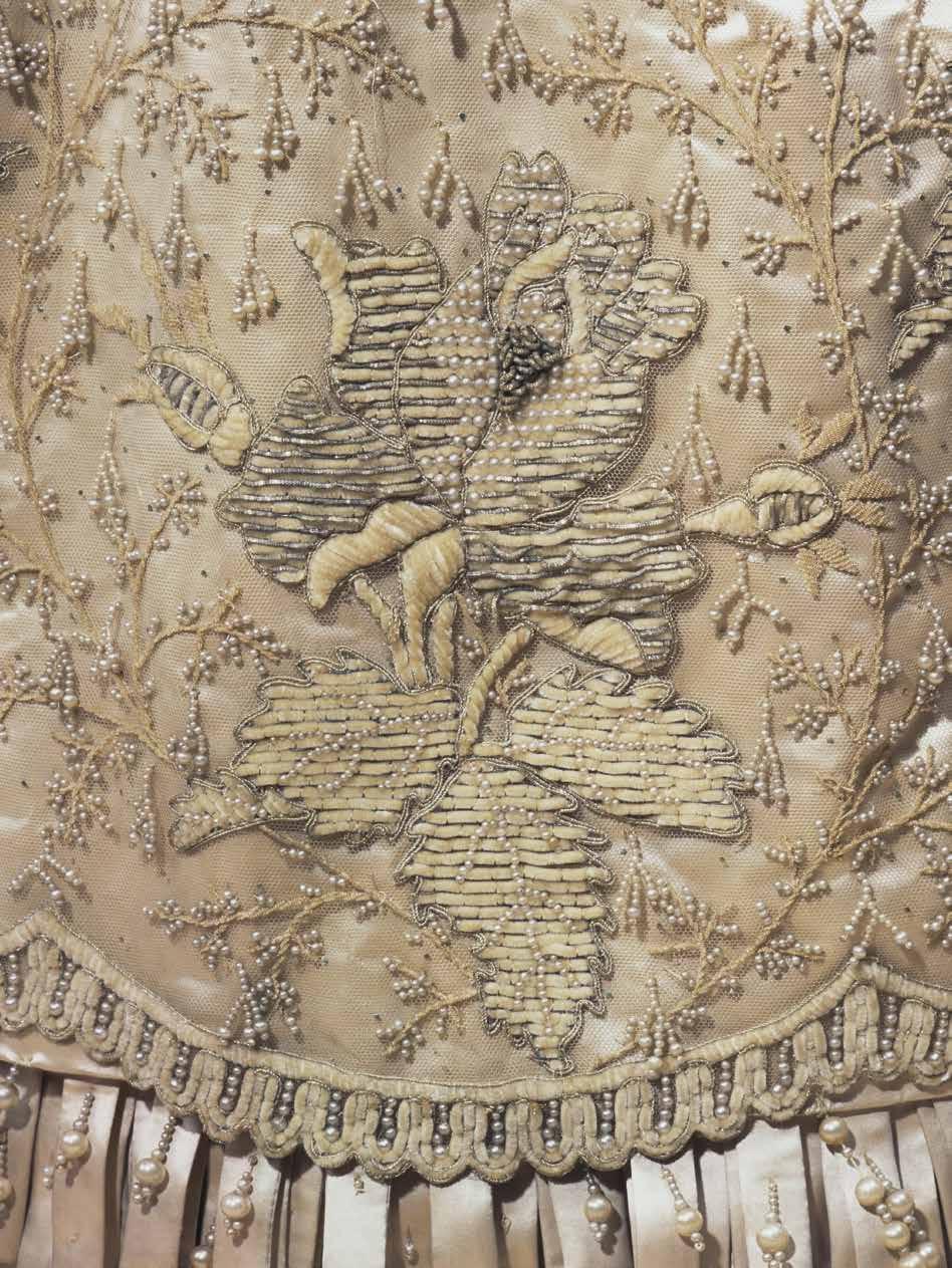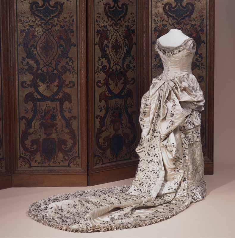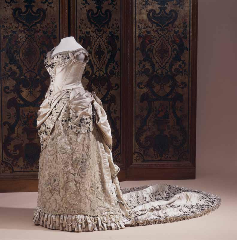 Trouwjurk van koningin Emma De Opregte Haarlemsche Courant beschreef op 10 januari 1879 voor de lezers de trouwjurk van de nieuwe koningin: ‘Het toilet der Bruid bestond uit een kleed van witte zijde met een zilverborduursel van bloem, en het koninklijk hermelijn bedekte de schouders’. De zwarte vlekjes op de jurk zijn zilveren pluiskwastjes die inmiddels zwart zijn uitgeslagen.