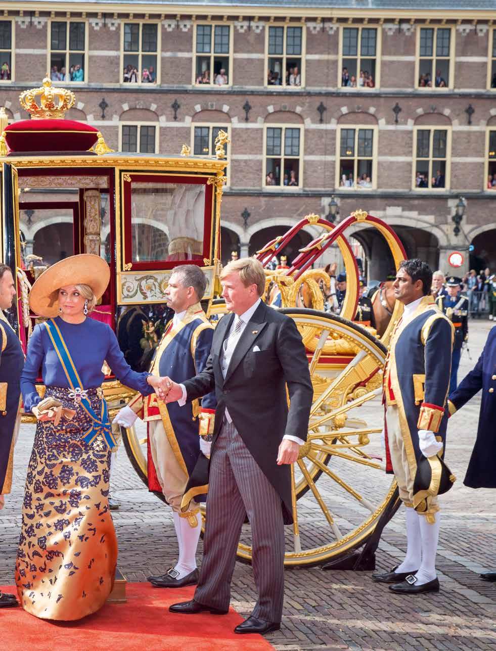 Koning Willem-Alexander en koningin Máxima tijdens Prinsjesdag 2016. De koning is gekleed in jacquet (morning suit), koningin Máxima draagt een avondjurk door Claes Iversen.