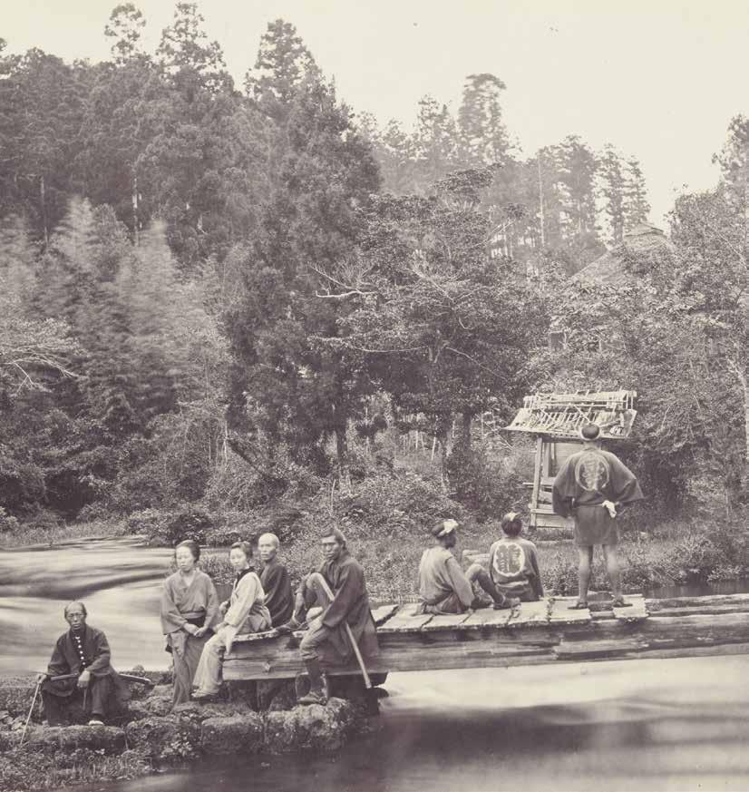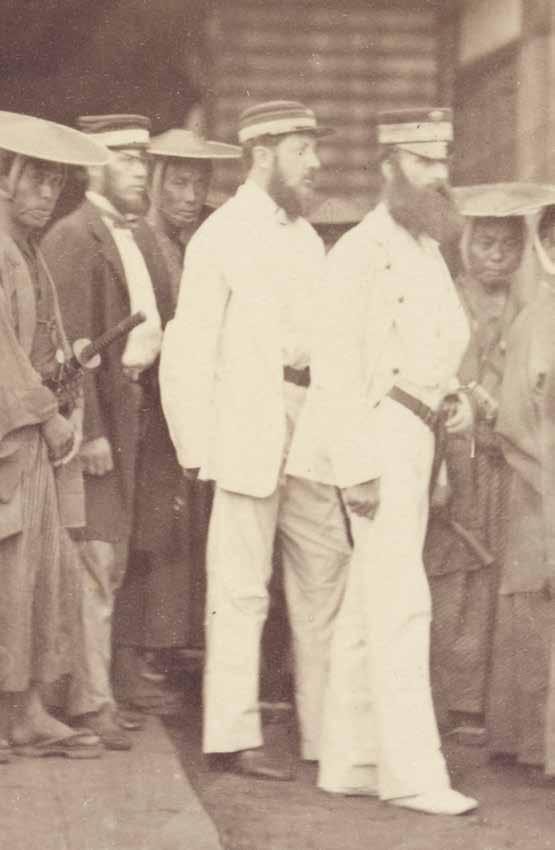 Felice Beato (1832-1909), Dirk de Graeff van Polsbroek (white suit, right) and Secretary J.P. Metman (white suit, left) with a Japanese escort at Chō’ōji temple in Edo; (Detail, full picture on p. 75)