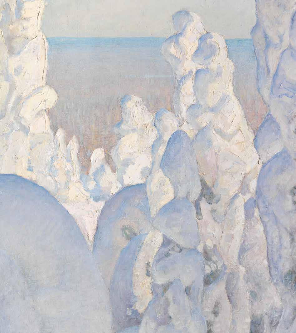 Het werk van Halonen getuigt van een subjectieve en delicate omgang met het winterlandschap, aangezien hij de natuur zag als een meditatieve, spirituele omgeving, van zichzelf al waardevol. De behoefte om het bos en de bomen af te beelden behield hij zijn hele leven. Hij schilderde hoofdzakelijk buiten, ongeacht het weer, en zijn benadering van het onderwerp laat zijn uiterst persoonlijke houding ten opzichte van de natuur zien. Halonen begon in 1895 met het schilderen van winterlandschappen. Zijn passie voor de decoratieve vormen in sneeuw is te zien in een klein temperaschilderij, Besneeuwde jonge dennen (1899, afb. 122, p. 143). Dit werk vormt een treffend voorbeeld van Halonens closeup voorstellingen van besneeuwde bomen, waarbij hij gebruik maakte van een helder en sober kleurenpalet.