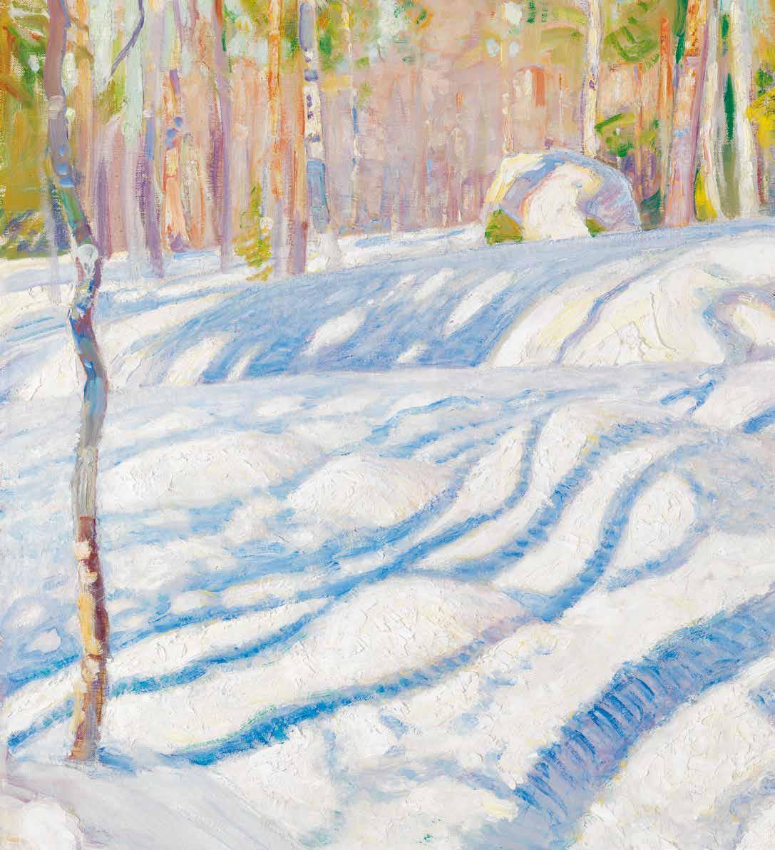 Het moet een frisse ochtend zijn geweest toen Pekka Halonen (1865-1933) de bomen, de heuvel en de sneeuw in de winterzon vastlegde op het doek. Niet met wat snelle potloodschetsen om later uit te werken in zijn warme atelier, maar dáár, ter plekke in de vrieskou: vastleggen wat je ziet, hoe het is. Stammen van bomen zijn bruin zou je denken, maar Halonen gebruikte paarse verf, blauw, geel, oranje, wit, groen en wat bruin. En om de schaduwen in de witte sneeuw uit te beelden koos hij blauw, geel en lila. De hoogteverschillen in het landschap kregen vorm door de verf dik aan te brengen of juist glad te maken.