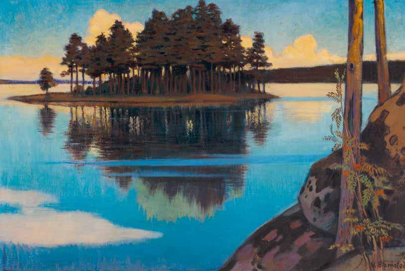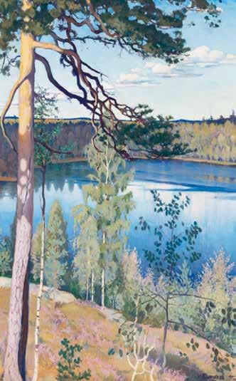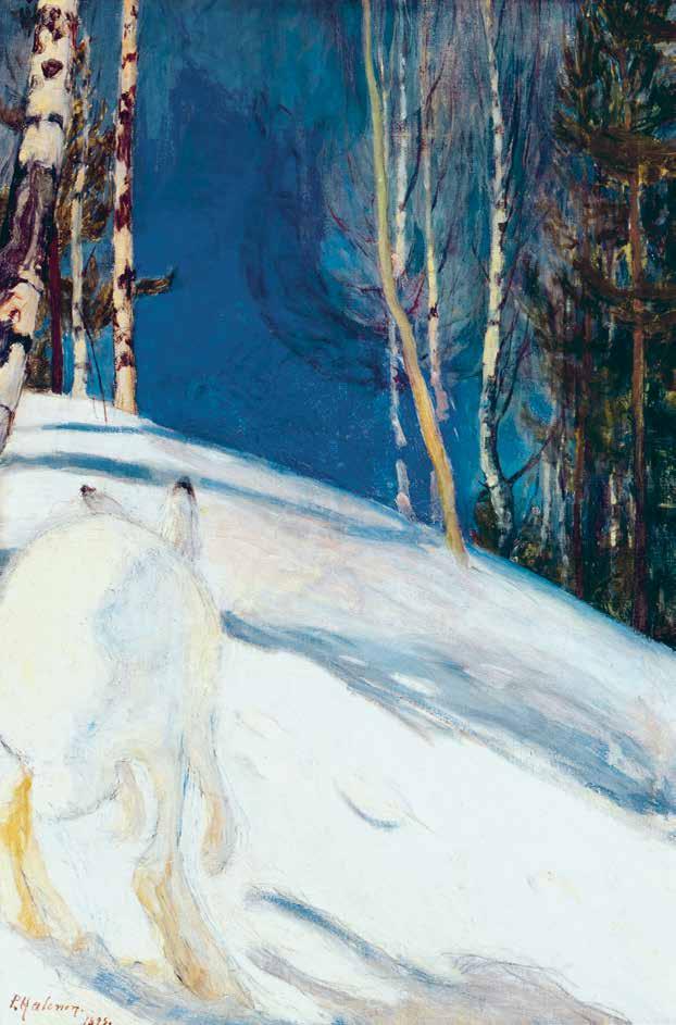 theosofie, wat een levenslange interesse zou worden en zich vervlocht met de traditionele Finse cultuur.2 Bepaalde thema’s en elementen die Halonen zich als jonge kunstenaar eigen had gemaakt blijven terugkomen: authentieke landschappen en zijn waarnemingen diep in de bossen. Halonens carrière besloeg meer dan veertig jaar en ontwikkelde zich in meerdere fases. Hij heeft een paar van de interessantste periodes in de geschiedenis van Finland meegemaakt, van de tijd waarin het land nog een groothertogdom van het Russische Rijk was, tot de onafhankelijkheid in 1917 en de roerige jaren dertig.