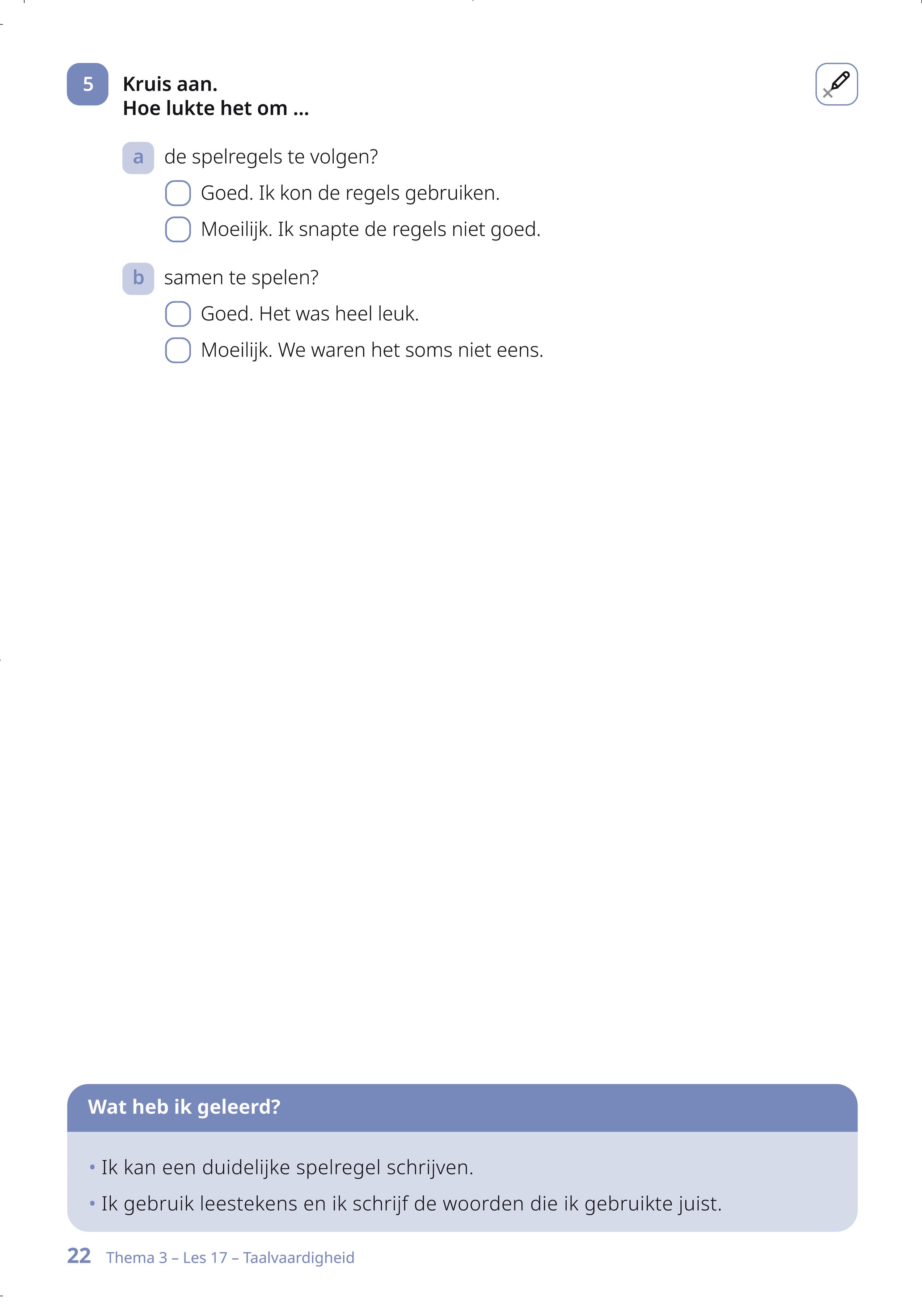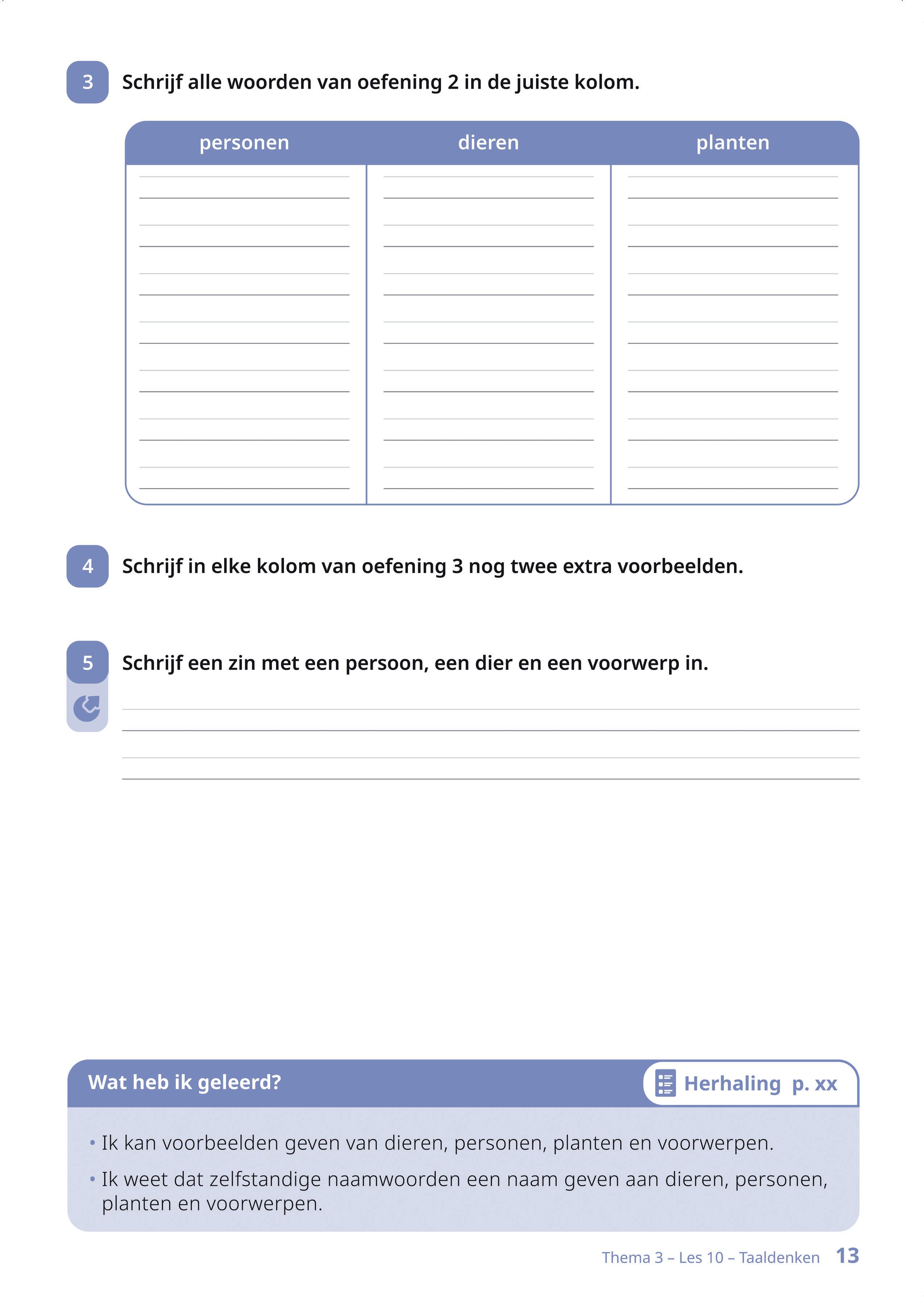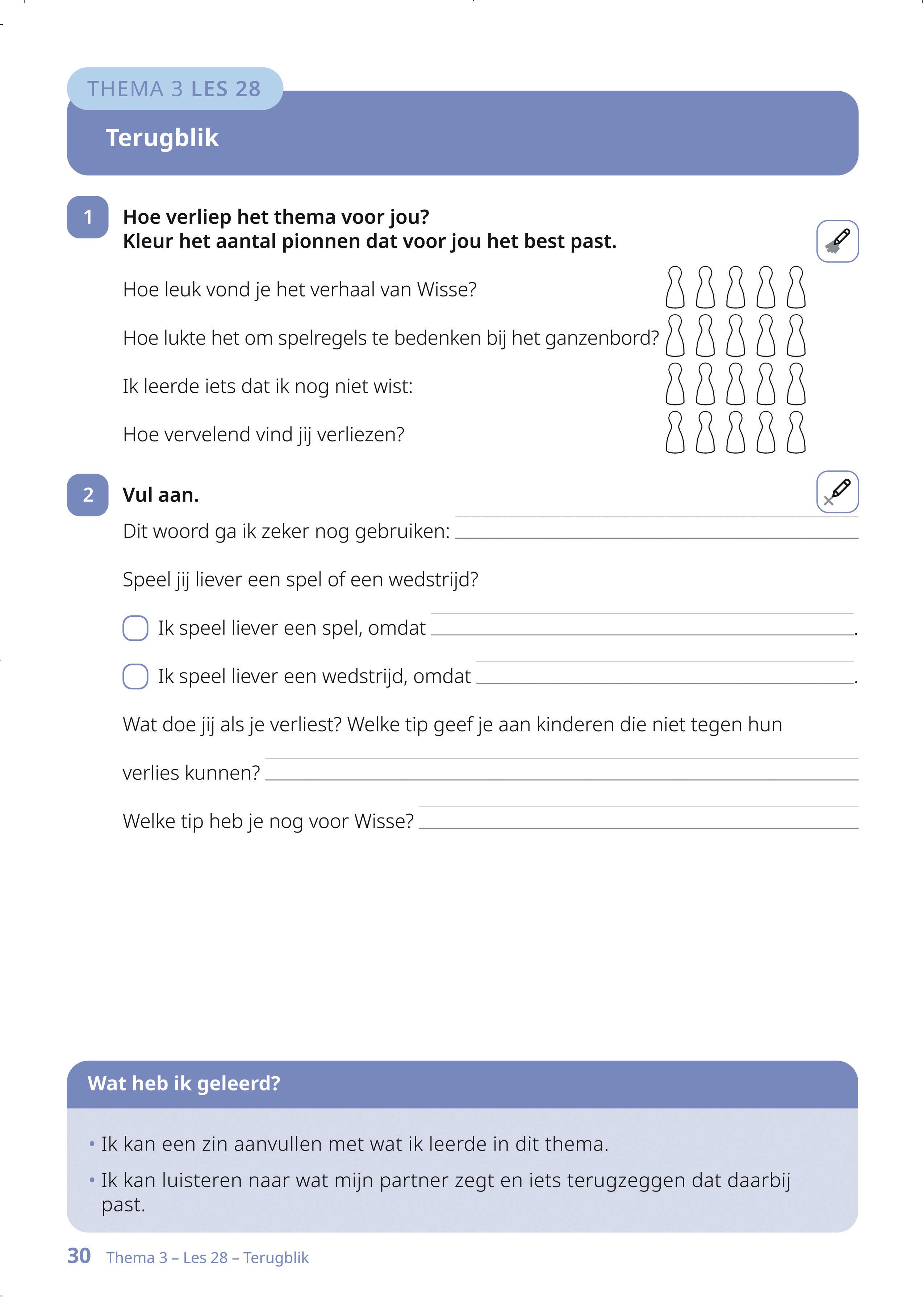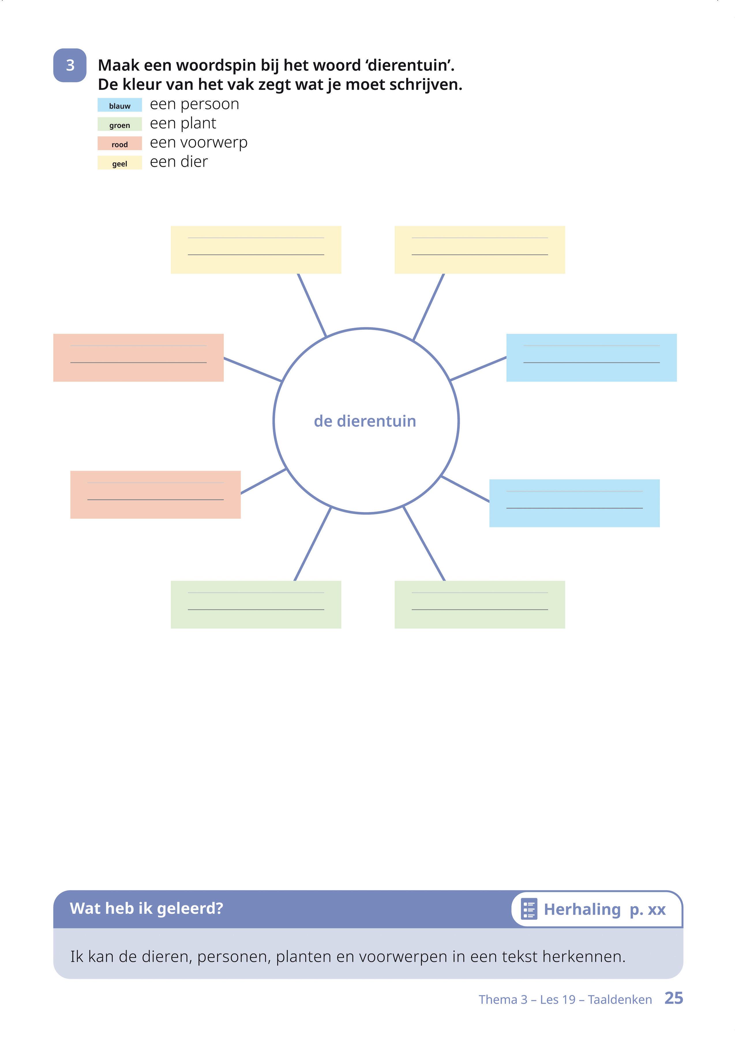 Op het einde van de les bespreek je de mate waarin je leerlingen de lesdoelen bereikten. Op de herhalingspagina duid je samen aan wie er tijdens de herhalingsweek nog extra oefening rond die doelen kan gebruiken.